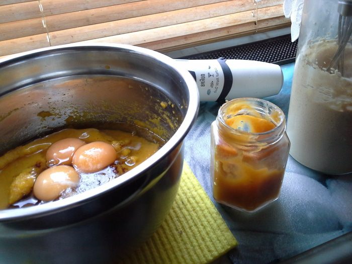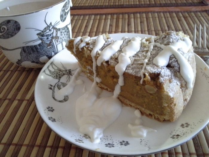 Начинка: тыкву разрезать пополам (у меня была не очень большая), завернуть в фольгу и на 1.5 часа в духовку при 200С. Ложкой достать мякоть, взбить блендером, добавить яйца и снова взбить. Затем добавить повидло (у меня яблочное с курагой, получилось очень вкусное) и муку, взбить. Добавить в начинку крахмал, корицу, соду и взбитые сливки, хорошо взбить.
