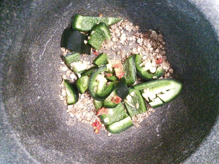 Теперь займемся арахисовой пастой. Кориандр и тмин нужно размолоть в ступке. Добавьте мелко нарезанный чили вместе с семенами и разомните в кашицу. У меня халапеньо и совсем не острый, вы регулируйте остроту соуса на свой вкус. Добавьте смесь азиатских специй.
