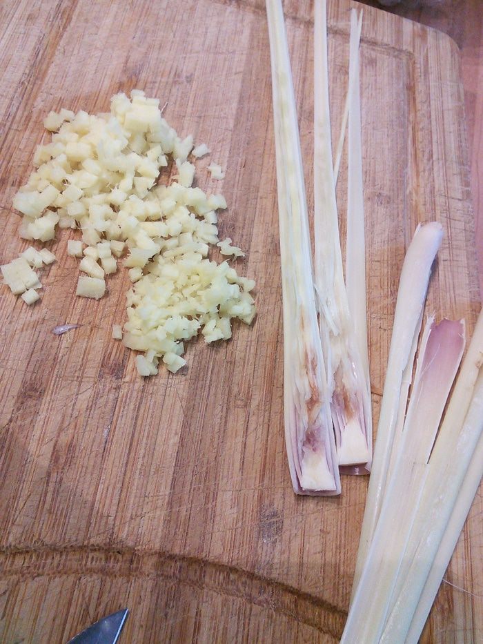 Мелко порубим имбирь. Лемонграсс очистим от двух твердых внешних лепестков, разрежем вдоль и тупой стороной ножа надавим на середину стебля, чтобы освободить эфирные масла и ароматы.
