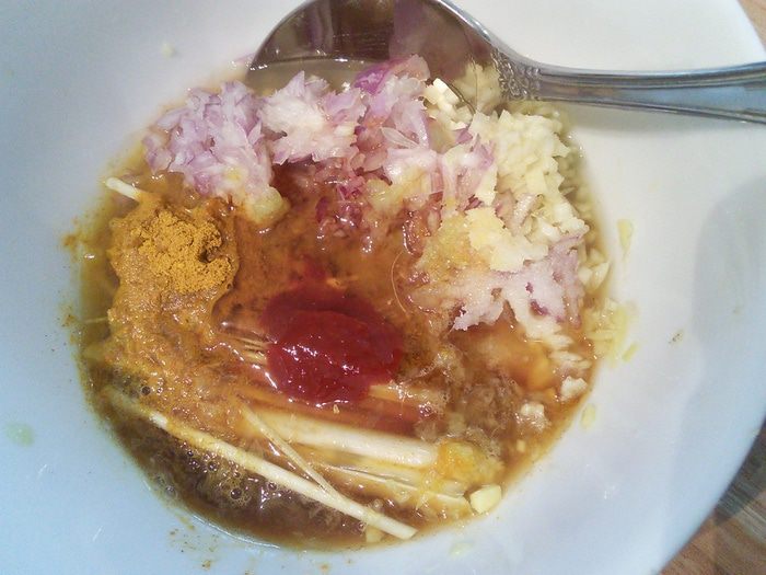 Теперь остаётся выжать сок из лайма и соединить все ингредиенты маринада в мисочке (самбал oelek я заменила на острый чили-соус, соль), а азиатскую смесь специй с добавлением мёда я использовала вместо ketjap Manis (это сладкий соевый соус).