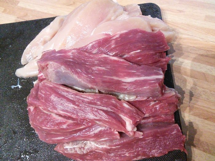 Мясо режем на продолговатые брусочки примерно 2х8 см.