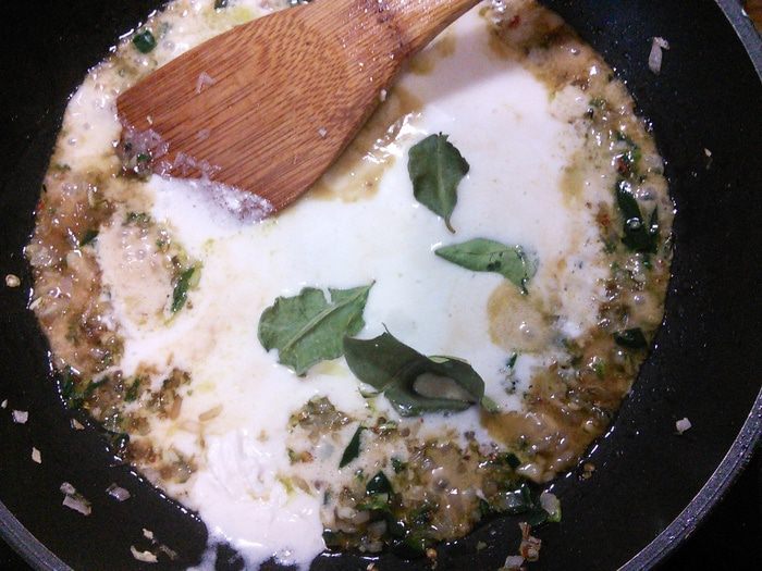 Вливаем кокосовое молоко, рыбный соус и кладём листья каффир-лайма.