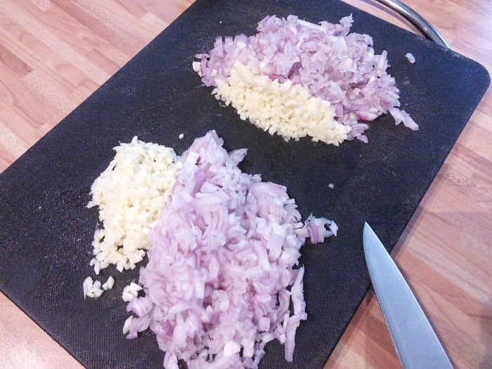 Для начала приготовим маринад. Для этого мелко нарубим шалот и чеснок. Для арахисовой пасты потребуется так же мелко нарезанные шалот и чеснок, поэтому я это сделала сразу.