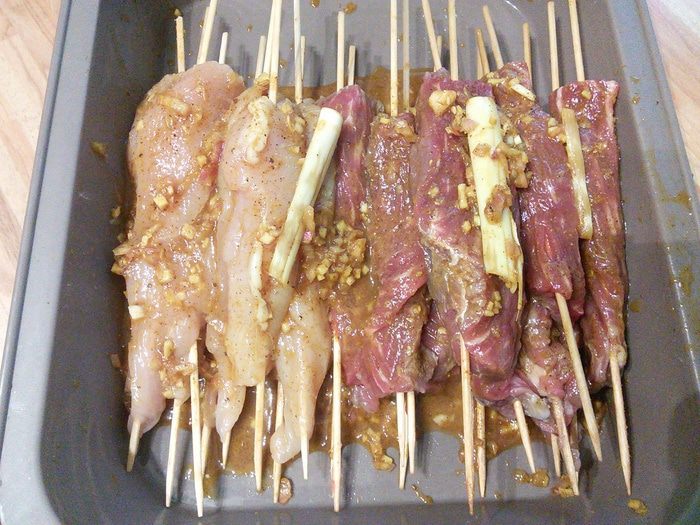 Теперь остаётся пожарить сате на гриле или в сковороде. На это уйдёт несколько минут на каждую сторону.