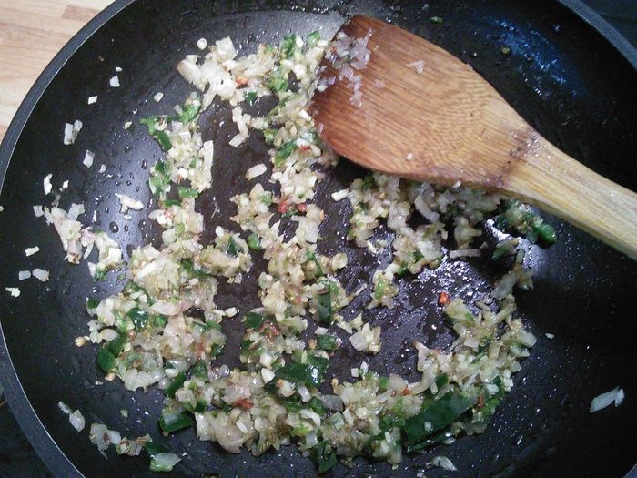 На разогретом масле пассеруем шалот и чеснок до прозрачности, добавляем специи, разогреваем до "благоухания" специй.
