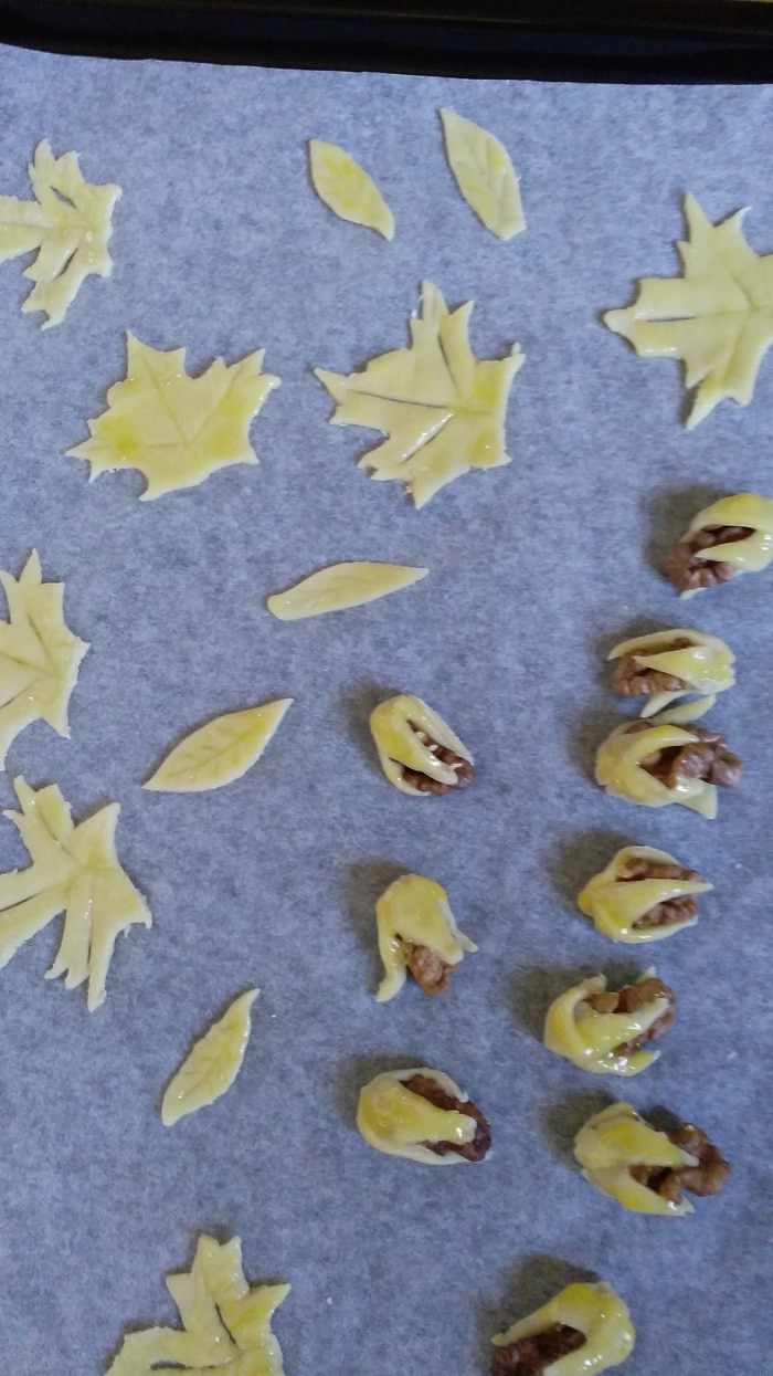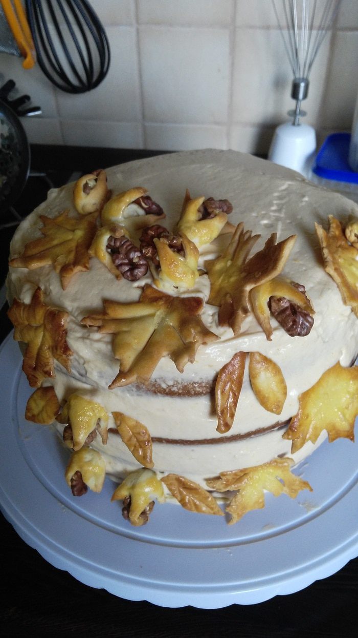 Тесто для декора я "утащила" из рецепта свадебного каравая, только добавила ложечку сахарной пудры. Нужно взвесить белок и добавить муку в количестве 2-х весов белка. Получается очень эластичное тесто, которое быстро сохнет, поэтому нужно завернуть в пленку. Листики я вырезала из тонко раскатанного теста, ножом, используя бумажный трафарет.