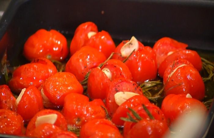 Выложить помидоры в небольшой противень, посыпать листьями розмарина, посолить, поперчить и полить оливковым маслом.