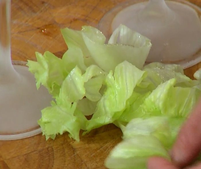 Листья салата порезать крупными полосками.