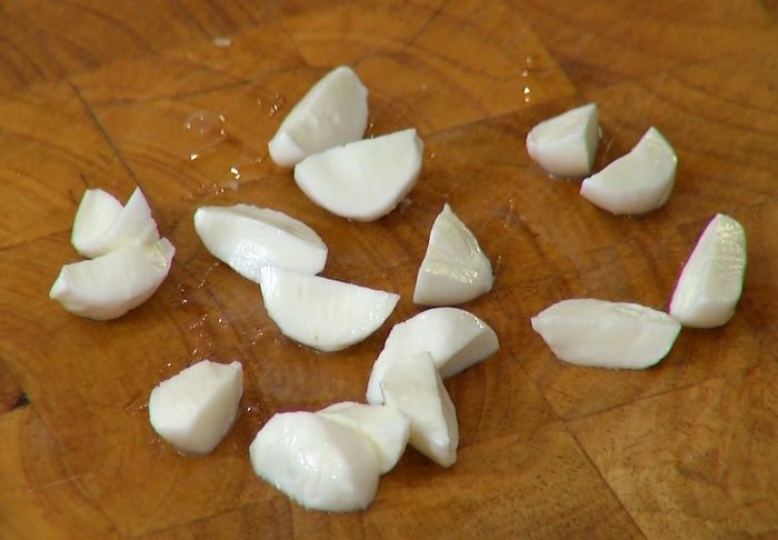 Шарики моцареллы разрезать на 4 части.