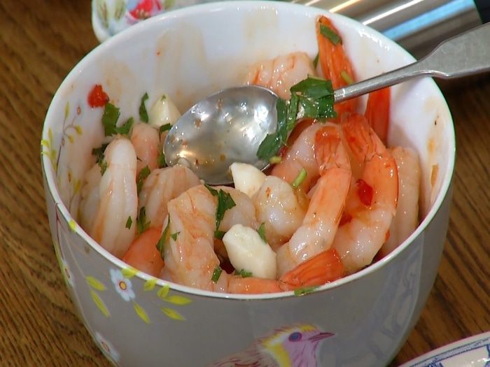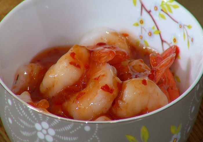 Креветки разморозить, затем залить чили-соусом, перемешать и дать постоять.