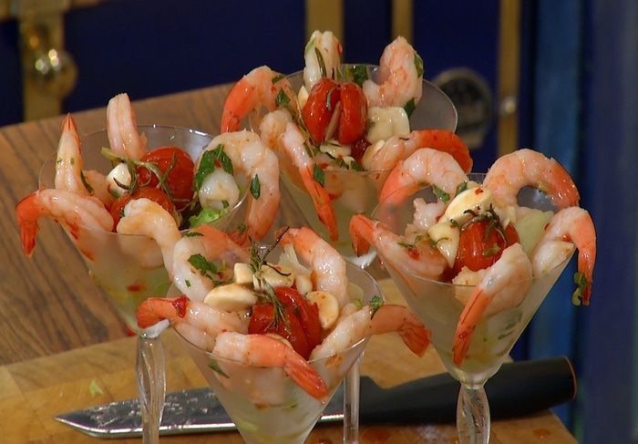 В охлажденные бокалы влить по 1 ч. ложке сока лайма, выложить полоски салата, запеченные помидоры с листиками розмарина, затем креветки и моцареллу, полить все оставшимся соусом от креветок и маслом от помидоров.
