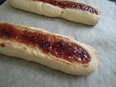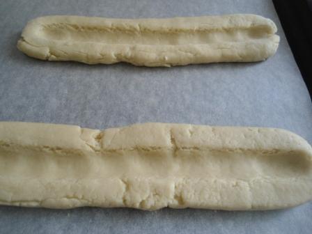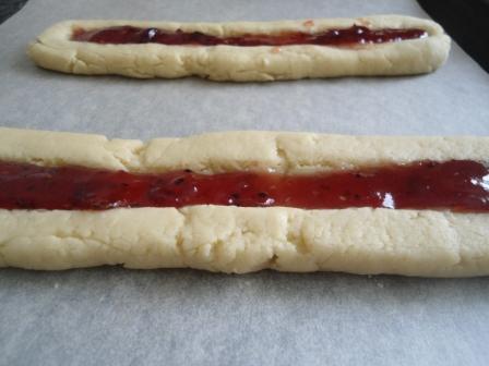 Добавляем муку, крахмал и разрыхлитель, замешиваем быстро тесто и делим его на две части, катаем колбаски( длина у меня около 20 см) и посередине делаем пальцем углубление. Выкладываем на бумагу для выпечки,ничем не смазываем.