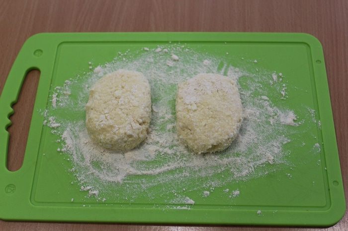 Насыпать кукурузную муку для обсыпки на доску. Сформировать сырники.