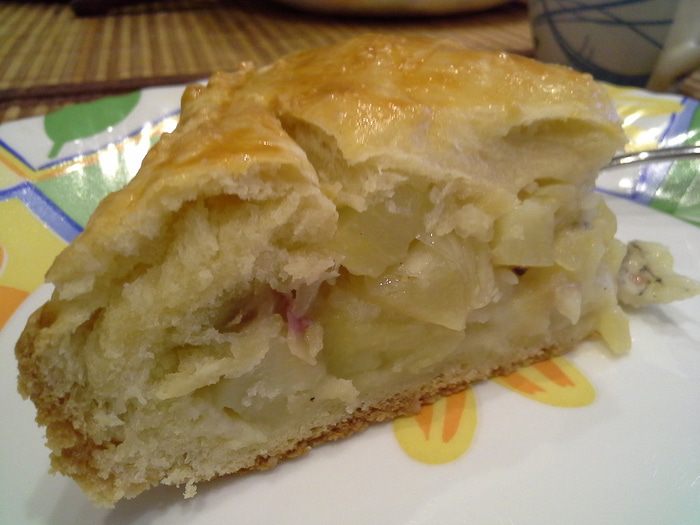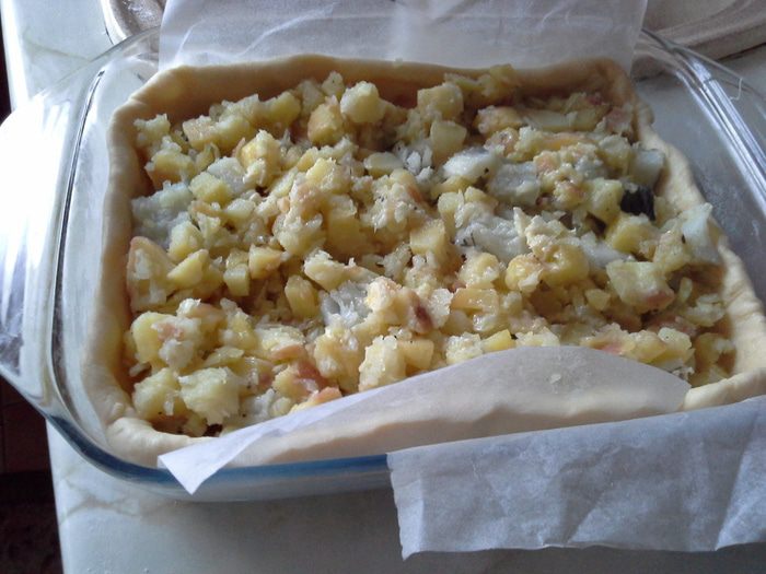 Рыба у меня ледяная, нужно удалить хребет и нарезать на кусочки, картофель отварной, теплый нарезать кубиками + сливочное масло, соль, перец по вкусу (картофель теплый — сливочное масло само тает) + одну луковицу (большую) измельчить блендером до пюре, если начинка получилась суховатая, добавить 2-3 ст.л воды.