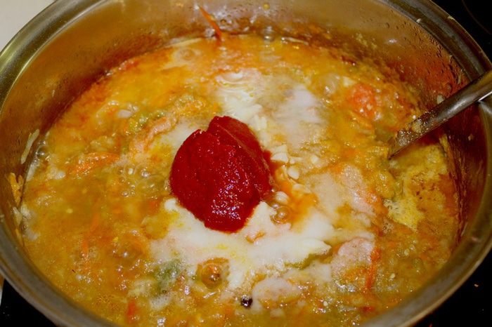 Посолить, добавить сахар, томатную пасту, измельченный чеснок. Перемешиваем и тушим всё ещё минут 15 .