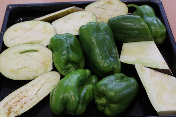 Баклажаны разрезам вдоль и делаем крестообразные насечки ножом. На противень выкладываем перец и баклажаны, слегка сбрызгиваем оливковым маслом. Ставим запекаться в духовке при 180°С примерно на 30 минут.