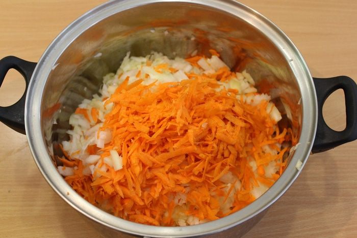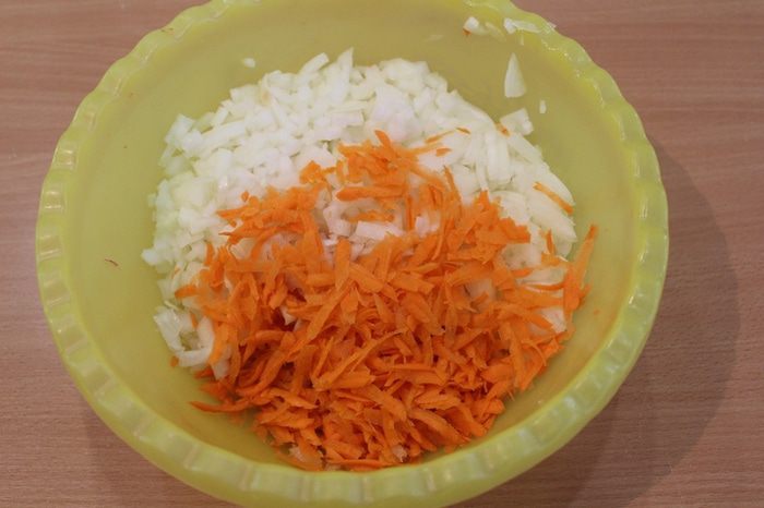 В это время морковь натереть, лук мелко порезать.