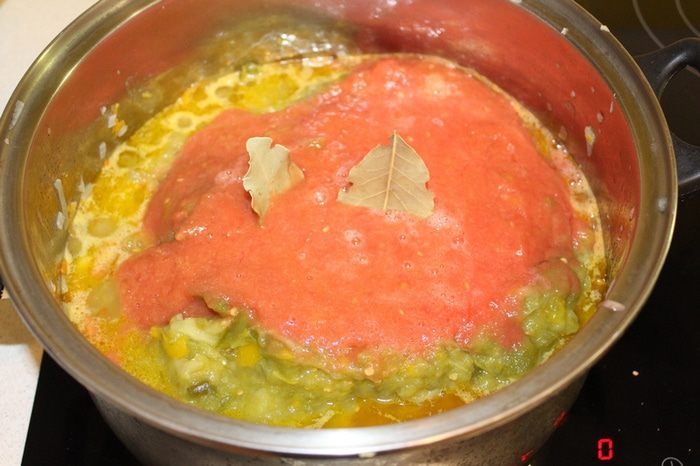 Затем измельчить баклажаны и перцы с помощью блендера и добавить к овощной смеси. С помидор снять кожицу, измельчить и так же добавить в кастрюлю, воткнуть лавровый лист.