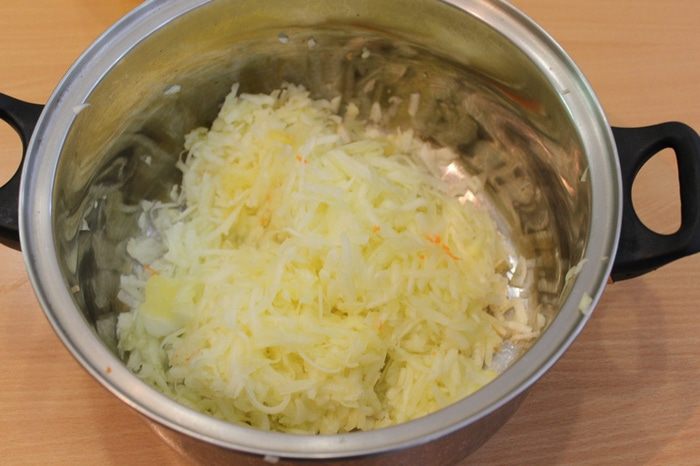 Поместить натертые овощи в кастрюлю с толстым дном, добавить масло и тушить 40 минут.