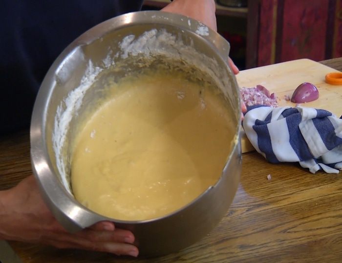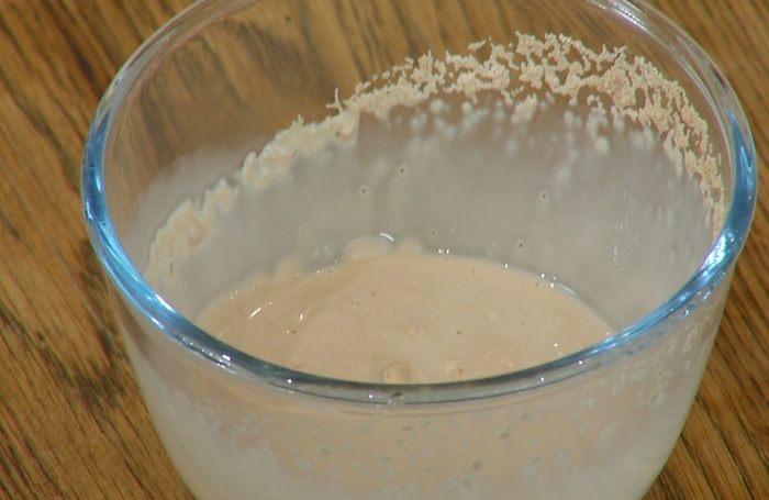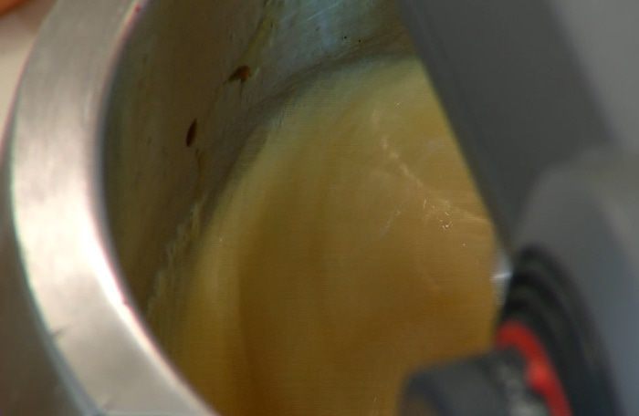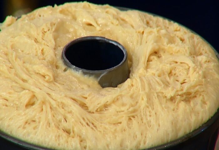 Заменить в комбайне венчик насадкой для теста (крюком), всыпать половину муки с солью и все вымешать, затем, не выключая комбайна, влить в тесто дрожжи, небольшими порциями всыпать оставшуюся муку и продолжать вымешивать, пока не получится однородное тесто.