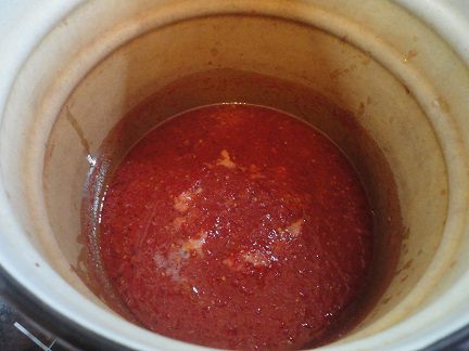 Помидоры пропускаем через мясорубку и отмериваем 2 литра получившегося сока. Выливаем его в посуду для варки лечо (моя ведерная эмалированная кастрюля приобрела стойкий окрас), добавляем мед, сахар, соль и масло. Доводим до кипения и варим 5 минут.
