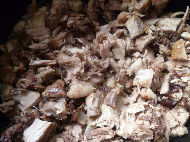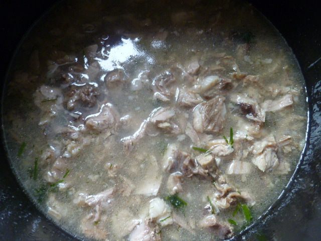 А затем берем пластиковую 1,5 литровую бутылку, обрезаем горлышко и переливаем в нее получившийся бульон вместе с мясом.