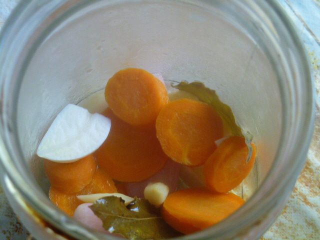 Выбираем овощи и половину кладем в стерилизованную банку.