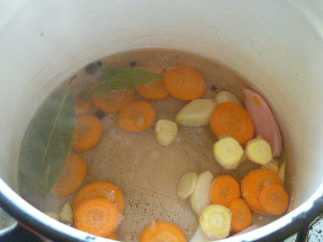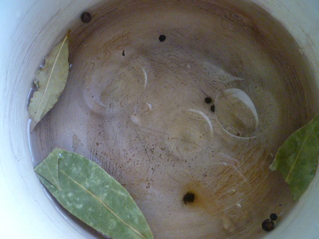 Готовим маринад. В кастрюлю наливаем воду и уксус, добавляем специи и растительное масло. Доводим до кипения.
