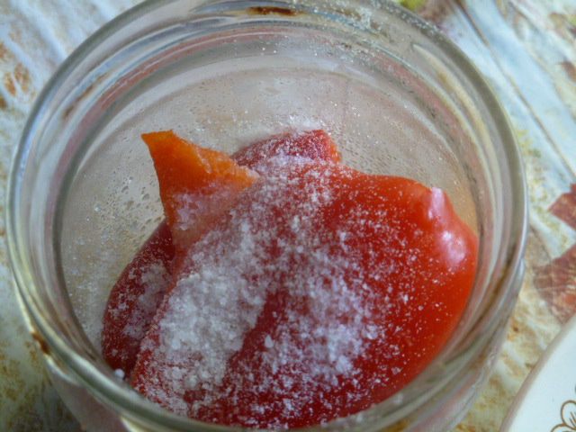 Укладываем перец в банку, насыпаем соль, по бокам укладываем остальные специи.
