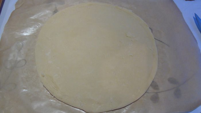 Раскатайте тесто в круг. Выровняйте ножом края.