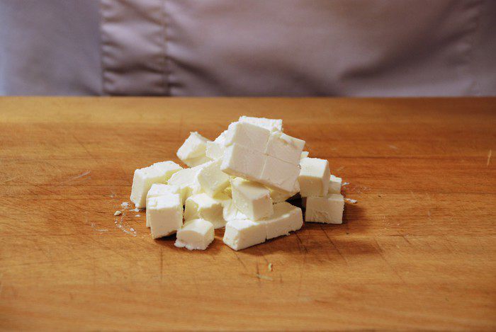 Огурец нарезать полосками, а фету - небольшими кубиками.