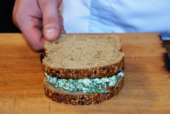 На ломтик хлеба выложить яичный салат, накрыть вторым ломтиком. По желанию срезать корки.