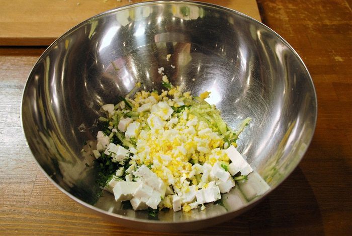 Нарезать яйца и смешать все вместе, добавив мягкий сыр и немного соли. Слегка поперчить.