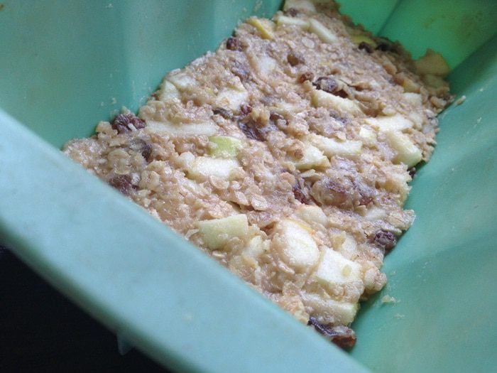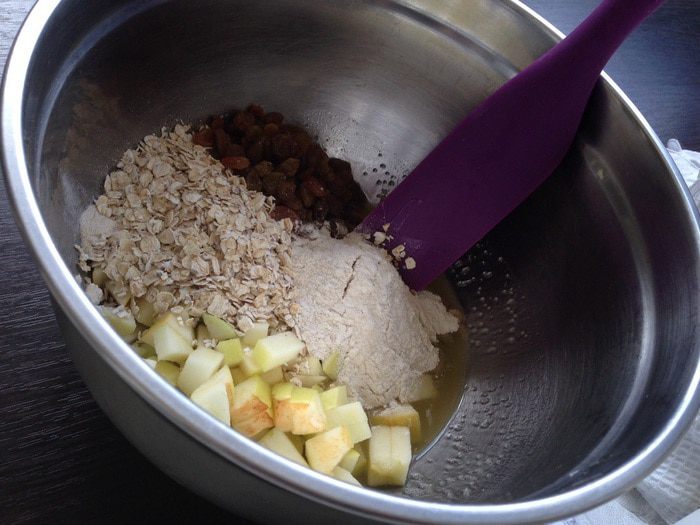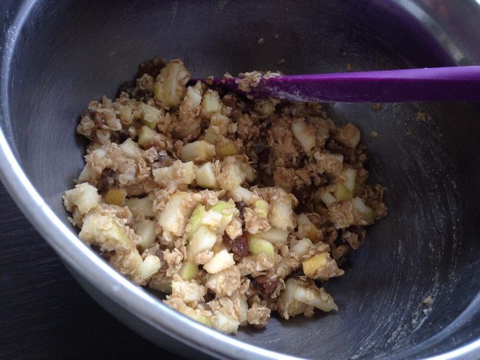 Добавить яблоки, овсяные хлопья, цельнозерновую муку, разрыхлитель и имбирь.