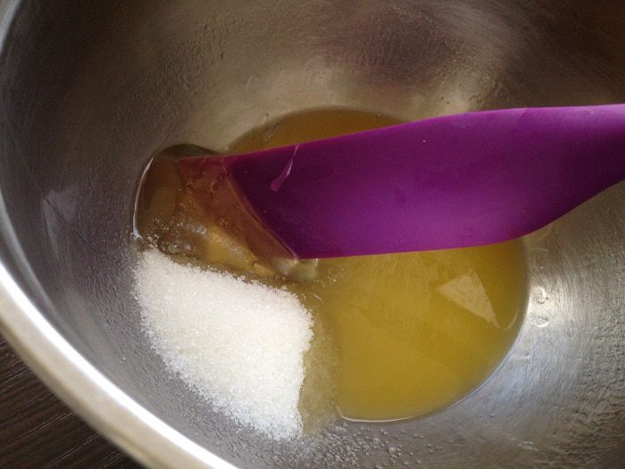 В миске соединить растопленное масло, сахар, мед и щепотку соли. Хорошо перемешать.