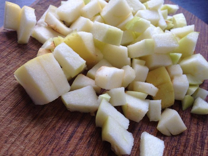 Яблоко вымыть и нарезать небольшими кубиками.
