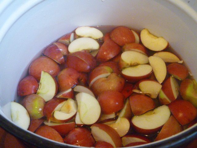Яблоки хорошо промыть, нарезать на 4 части, ничего не вырезая, и залить водой до половины яблок.