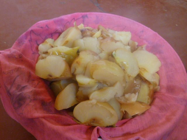 Выливаем получившийся сок и выкладываем яблоки, чтобы вся жидкость стекла на пару часов.