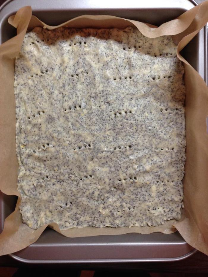 Выложить тесто в форму, застеленную пергаментом, и руками разровнять по всей поверхности. Форму лучше брать небольшую (у меня прямоугольная 19х22 см) и слой теста делать не тоньше 1 см.