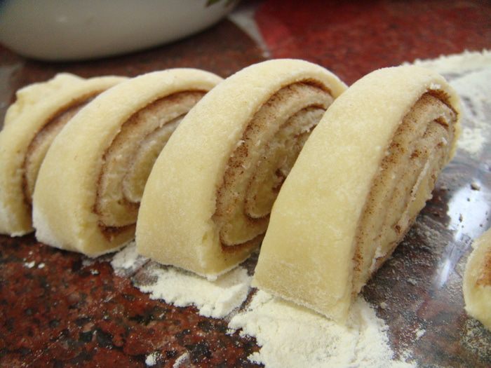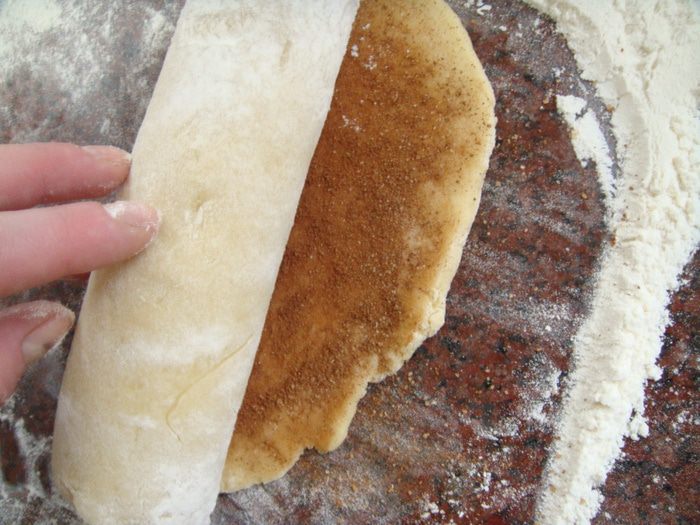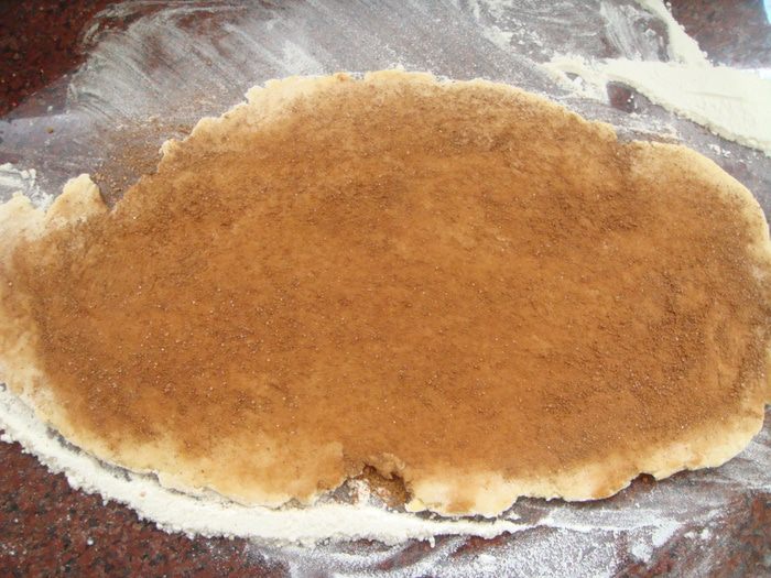 Раскатать часть теста в пласт. 2 ст ложки корицы смешать с 1 ст ложкой сахара, выложить на пласт теста и ладонью распределить равномерно по поверхности.