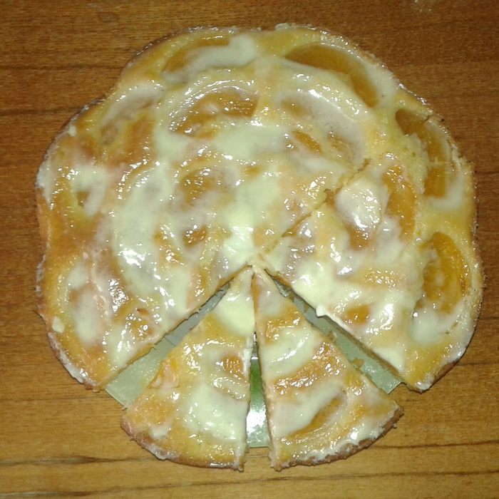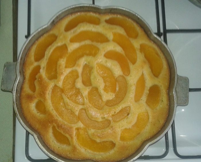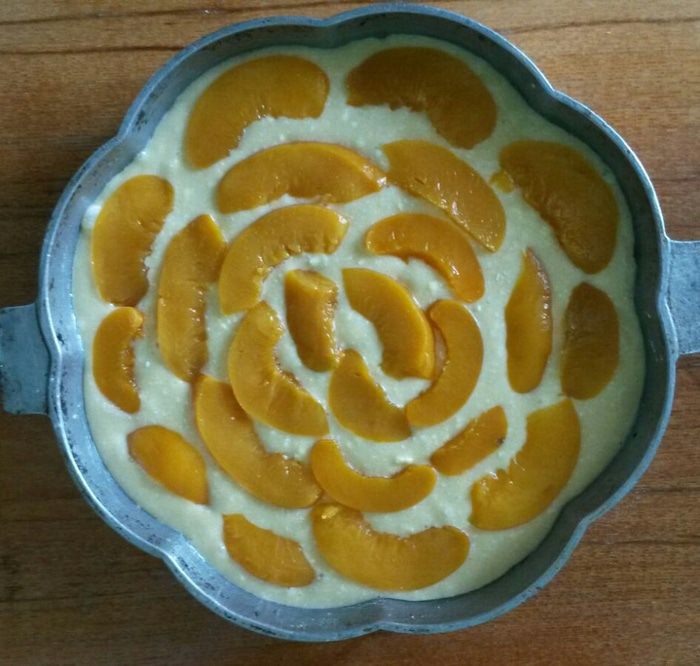 Персики выкладываем сверху. В данном случае они были крупные, поэтому я их порезала. Обычно выкладываю целиком.