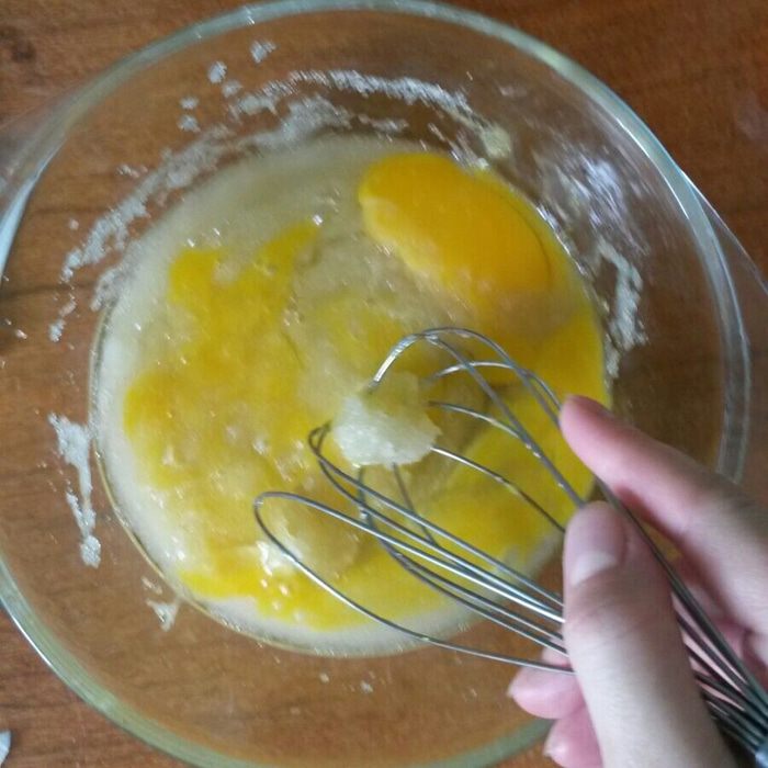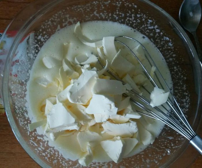 Яйца смешиваем с 200 гр сахара (остальной сахар будет использоваться позже) и взбиваем.