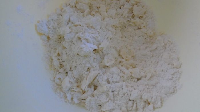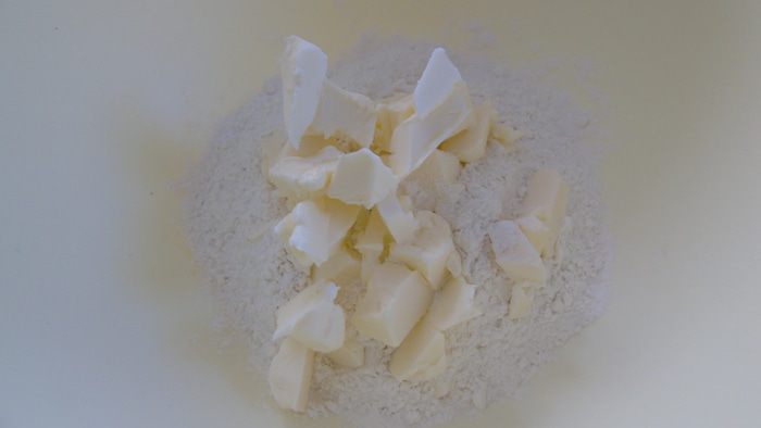 Вначале приготовим тесто: муку смешиваем с солью, добавляем холодное масло ,нарезанное кусочками.