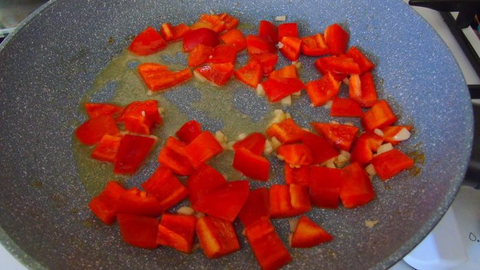 На этой же сковороде чуть припустить перец, нарезанный кубиками, и измельченный чеснок.