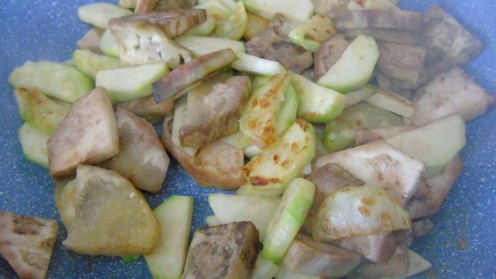 Обжарить очищенные и нарезанные кусочками кабачки и баклажан.