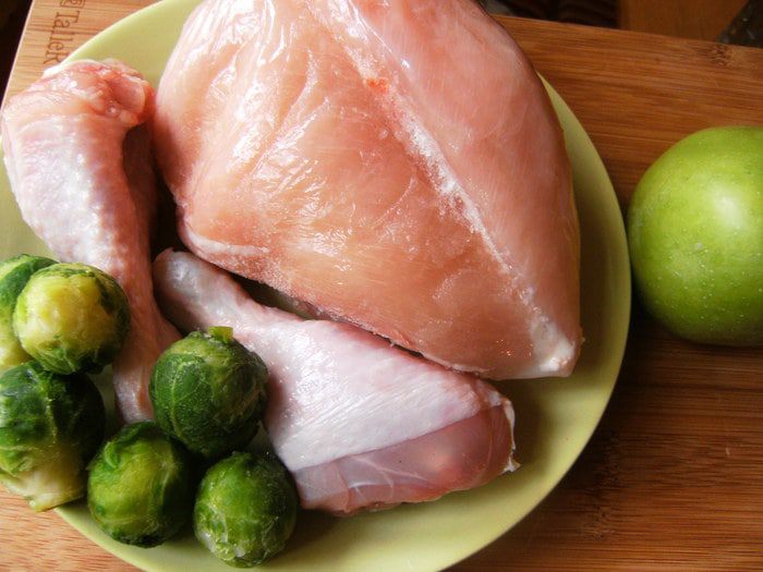 Мясо грудки измельчить блендером, а с бедренной части нарезать кусочками.