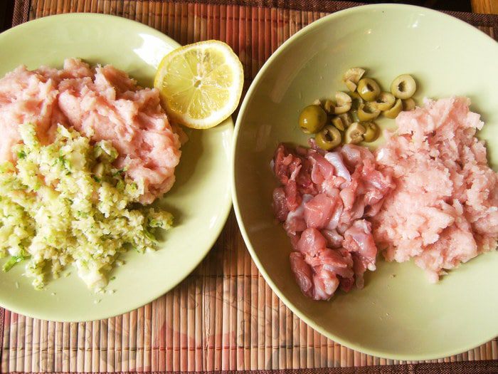 Подготовить ингредиенты для 2 видов колбасы. Оливки во втором варианте можно заменить любой смесью овощей, а капуста брокколи будут и выглядеть в колбасе красиво, и придадут ей новый вкус.