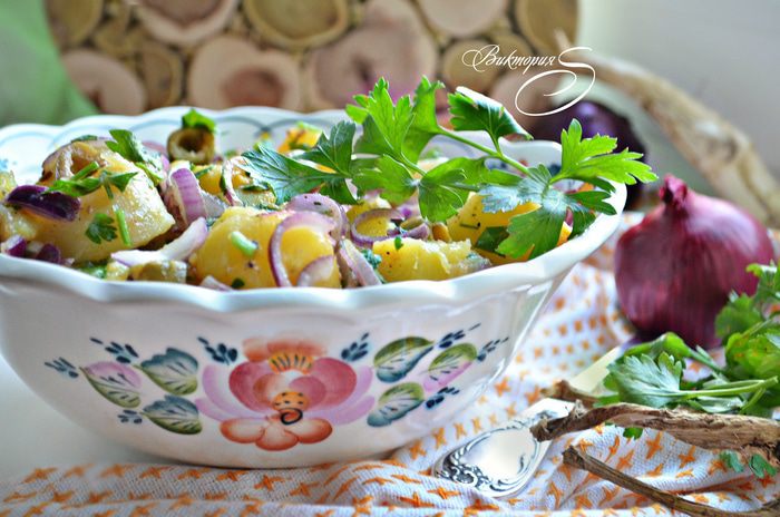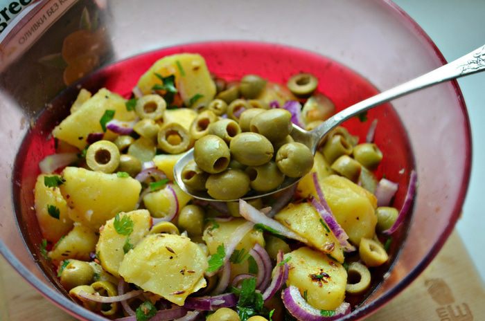 Оливки нарежьте кружочками, красный лук тонкими полукольцами и добавьте вместе с петрушкой к картофелю. Затем смешайте с заправкой, аккуратно перемешайте, дайте немного настояться и подавайте к столу.