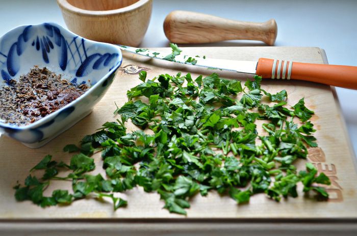 Зелень петрушки промойте, обсушите и мелко порубите. Измельчите зиру, смешайте с соком лимона, паприкой, перцем, солью, оливковым и арахисовым маслом.