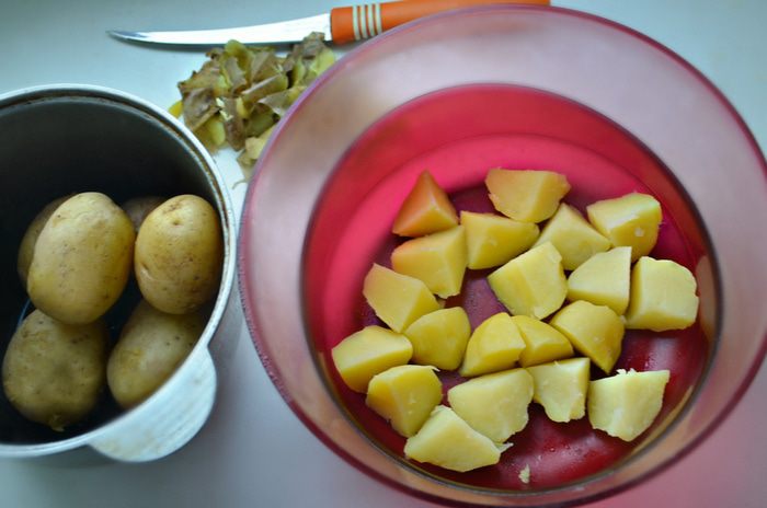 Для приготовления этого салата потребуется некрупный, лучше молодой, картофель. Хорошо его промойте и отварите в мундире до готовности. Готовый картофель остудите, почистите и нарежьте на половинки или четвертинки, если картофель не очень мелкий.